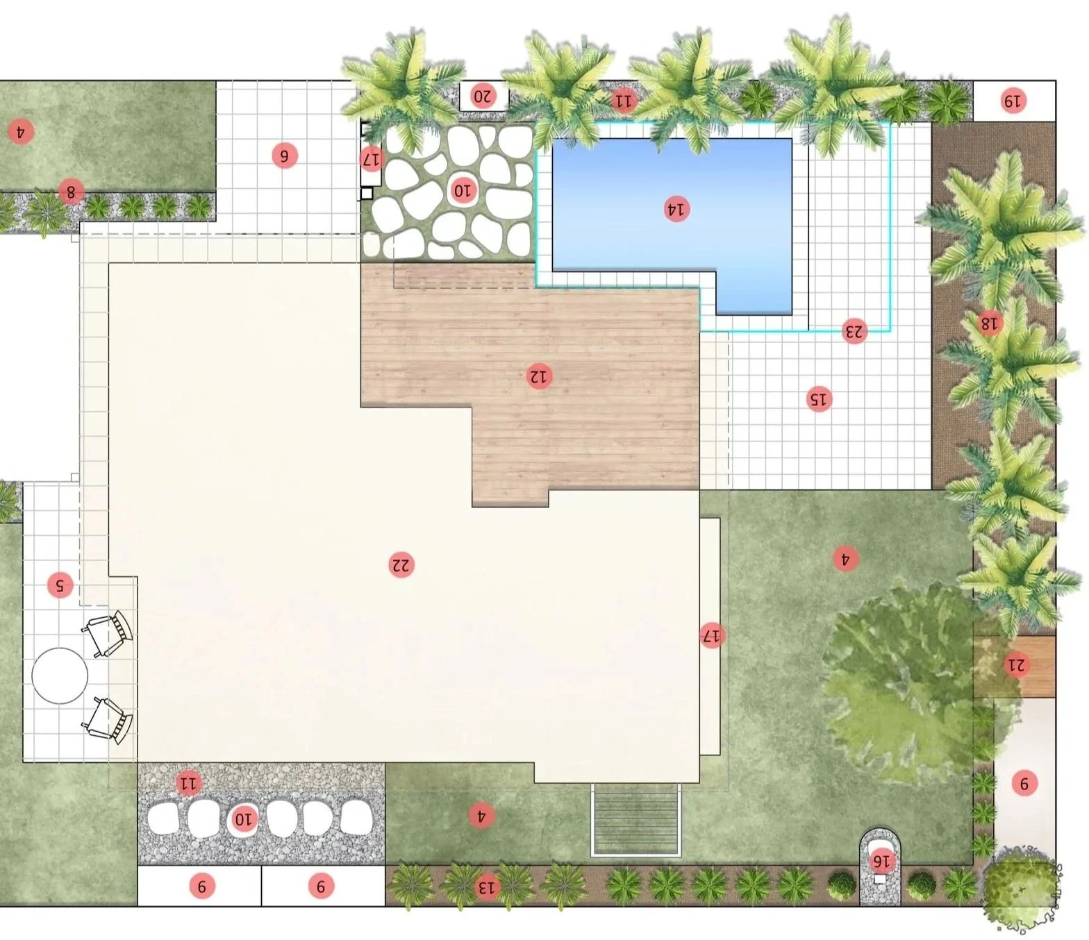 A complete 2D design including layout and construction plans, presented with considered material selections and reference imagery.